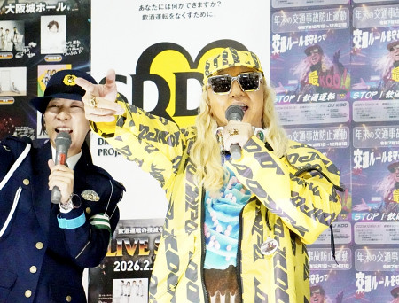 大阪府警は1日、アーティストのDJ KOOさんを招き、交通事故防止キャンペーンを開いた。反射材を着けたジャケットと帽子を身にまとい、「NO!飲酒運転!最KOO!」とアピールした=大阪市 【時事通信社】