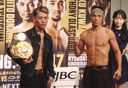 プロボクシングのトリプル世界戦の前日計量が16日、東京都内で行われ、王座統一戦で対戦するWBAバンタム級チャンピオンの堤聖也(左)、WBA同級暫定王者のノニト・ドネアら出場選手は1回でパスした。 【時事通信社】