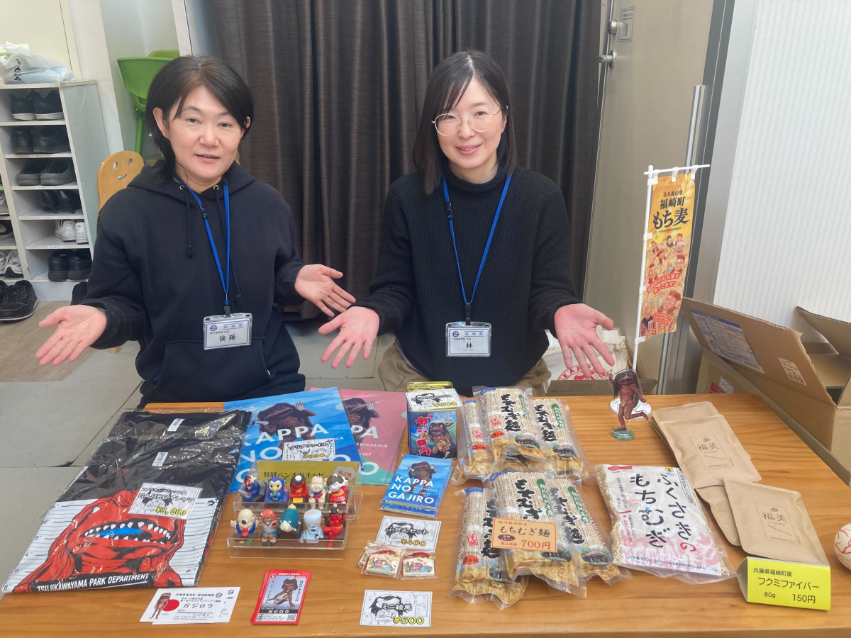 当日は、福崎町地域振興課の林知澄さんが、ガジロウの肌の色が赤い理由が柳田國男の著書である遠野物語の記載に基づいていることを紹介したほか、ガジロウに関するクイズを出題。その後、農林振興課の後藤有岐子さんが、同町産のもち麦と料理方法を紹介した。
