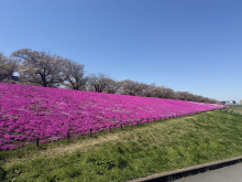 荒川河川敷を訪れていた40代男性は「昨日、今日と風が強く、桜の木は葉桜になってしまったが、芝桜の赤紫のじゅうたんに、文字の部分の白がきれい。散歩しながら、近くで見るのもいいが、鉄橋を通る電車からも見えそうなので、全体も楽しんでみたい」と話していた。