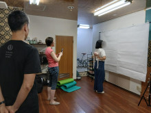 当日の講習会には2人が参加。同ジム代表でトレーナーの菅明宏さんが約30分にわたって指導。着物を着る時に腕を後ろに回す動作が多いことから肩甲骨がスムーズに動くようなエクササイズや立ち姿が美しく見えるよう首のストレッチなどを行った。「ストレッチは美しい所作をつくるための土台。肩こりや腰痛の予防にもなるので、日常生活の中で習慣化してほしい」と菅さん。