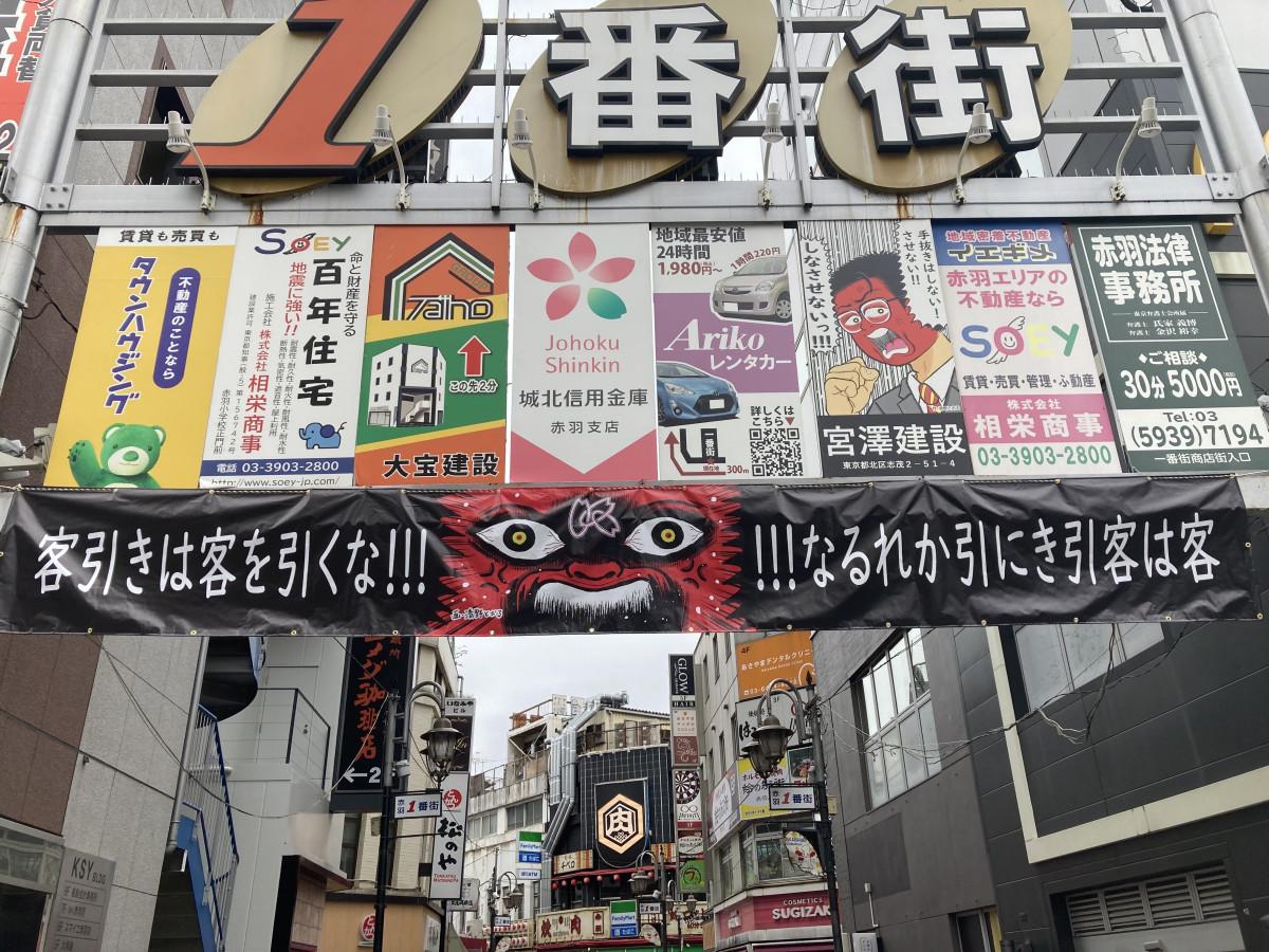 赤羽一番街商店街の入り口アーケードに10月21日、漫画家の清野とおるさんデザインの横断幕が掲げられた。